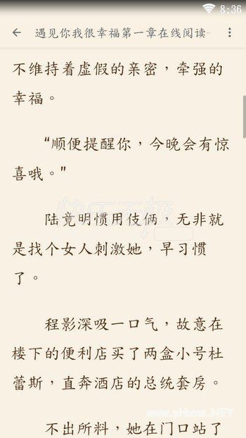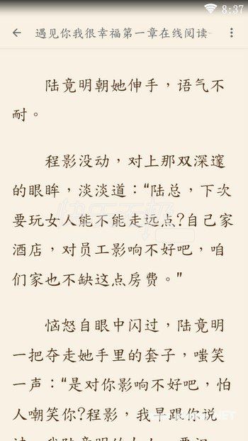遇见你我很幸福全文免费阅读资源已出,小说生动的情节,巧妙的构思,细腻的人物形象刻画和读者与作者之间的思想所产生的共鸣。让人能在小说中感受到精彩的故事情节发展和夹杂在小说中人物感情抒发的一些人生感悟。可以这样说,看完一部小说就是读过一场人生。