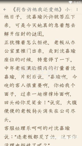 怎样免费阅读小说别告诉他我还爱他?下载安装App后在APP中搜索小说名《别告诉他我还爱他》,如果没有您要的小说,请联系APP内的客服!