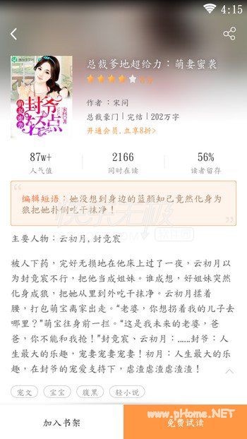 小说《总裁爹地超给力:萌妻蜜袭》在哪里可以找到?《总裁爹地超给力:萌妻蜜袭》从寻找真爱到发展,慢慢的找到属于自己爱情价值的过程,有甜腻的心情、也有分离的感伤。被人下药,完好无损地在他床上过了一夜,云初月以为封竞宸不行,把他当成姐妹。谁成想,好姐妹突然化身成狼,把她从里到外吃干抹净。全文情节跌宕起伏,非常好看。《总裁爹地超给力:萌妻蜜袭》无弹窗全文可在本站免费下载观看。