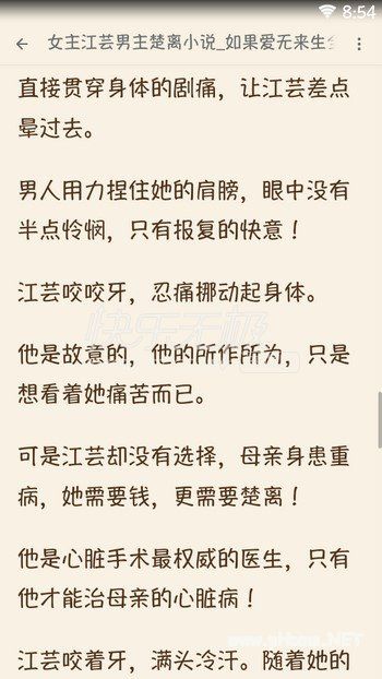 小说《如果爱无来生》中男主楚离向往爱情。却在芸芸众生中难求一份真爱。房门关上,整间病房又陷入黑暗。秦知秋也没有开灯,一步一步走到缩在角落的柳芊芊面前。墙上的一盏夜灯,洒下淡绿的幽光,笼罩着披头散发的柳芊芊,犹如疯子。绿光中,柳芊芊早就不是当年那副楚楚可怜的模样,三年不见天日的生活。在哪里能免费阅读《如果爱无来生》?更多精彩内容尽在小编提供的阅读APP。
