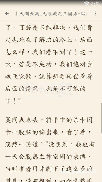 吴阀还没有反映过来,就发现自己所在的地方转眼变换了,从电话亭来到了一个草原,吴阀茫然了半晌,却还保持着拿电话的姿势。一分钟之后吴阀猛然醒悟,自己遇到不可思议的事情了。吴阀心中想了想耳边想起的那个女性的冷酷声音,这是三国杀的1V1教程场?三国杀吴阀不是没有玩过。这个游戏在近年风靡大陆,估计不少人都玩过,一直以冷静著称的吴阀也玩过,特别是1V1,除非是不可抗力,就比如黄盖数次苦肉,拿了超过5张杀,一张连弩,而自己手上却没有闪和桃之外,几百场单挑下来,吴阀的胜率一直保持在90%以上。