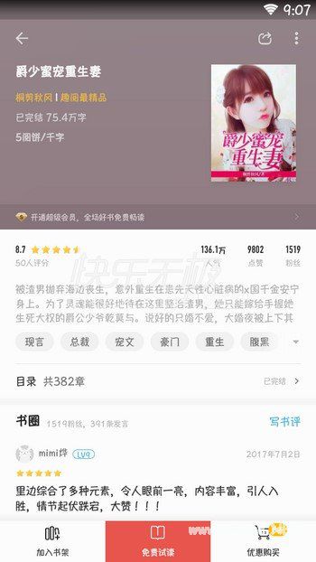 爵少蜜宠重生妻构思细腻而不失潇洒,笔触真实却华美,剧情环环相扣,引人爱不释手,感情交代清晰且含蓄,人物形象鲜活生动,跃然纸上,仿佛就站在读者面前,值得推荐!