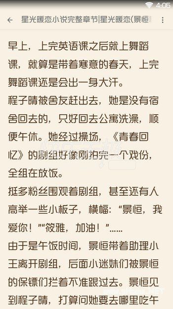 从此无心向明月,只要星光暖恋。读小说《星光暖恋》,看主角景恒程子晴的爱恋情仇。挺多粉丝围观着剧组,甚至还有人高举一些小板子,横幅:“景恒,我爱你!”“筱雅,加油!”……