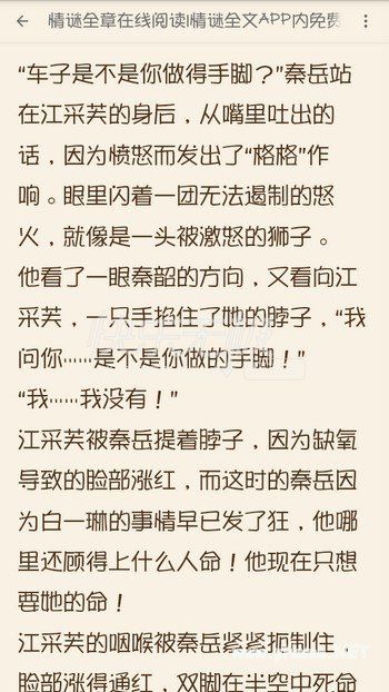 有些爱,只能止于唇齿,掩于岁月,就像《情谜》里这份爱,当爱情来临,你是否能够奋不顾身前去。江采芙被秦岳提着脖子,因为缺氧导致的脸部涨红,而这时的秦岳因为白一琳的事情早已发了狂,他哪里还顾得上什么人命!他现在只想要她的命!江采芙的咽喉被秦岳紧紧扼制住,脸部涨得通红,双脚在半空中死命地挣扎,喉咙间发出破碎沙哑的求救声。“放……开……我!”。想阅读《情谜》全本资源可以在本站APP内免费在线阅读全本章节。