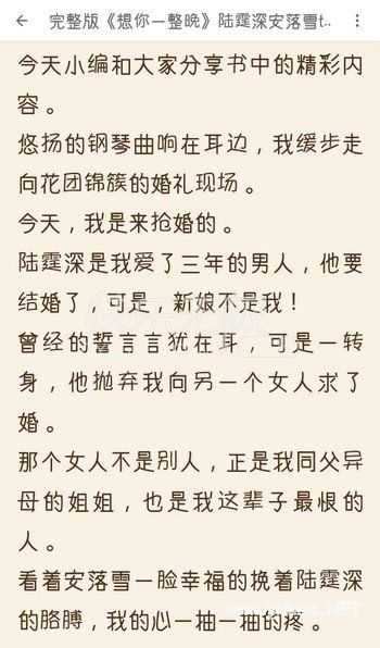 有的爱很美丽,有的爱很痴情,也有的爱只能生长在心里。小编推荐一本关于爱的方向的小说《想你一整晚》,他的话,像是一把锋利的刀子,剜着我的心。我下意识的跟着陆霆深的脚步下了楼,眼看着那辆黑色宾利扬长而去,此时此刻,我想哭,却发现,人在最痛心的时候,是没有眼泪的,在本站下载《想你一整晚》了解更多。
