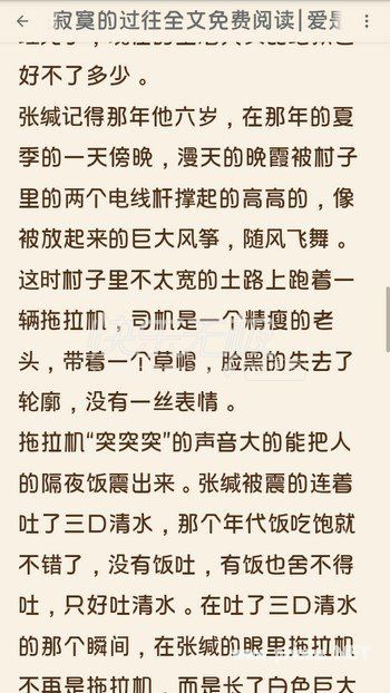 拖拉机“突突突”的声音大的能把人的隔夜饭震出来。张缄被震的连着吐了三口清水,那个年代饭吃饱就不错了,没有饭吐,有饭也舍不得吐,只好吐清水。在吐了三口清水的那个瞬间,在张缄的眼里拖拉机不再是拖拉机,而是长了白色巨大翅膀的天使,向满天的红色晚霞驶去,仿佛有无限的魔力,追上它就等于追上了幸福。