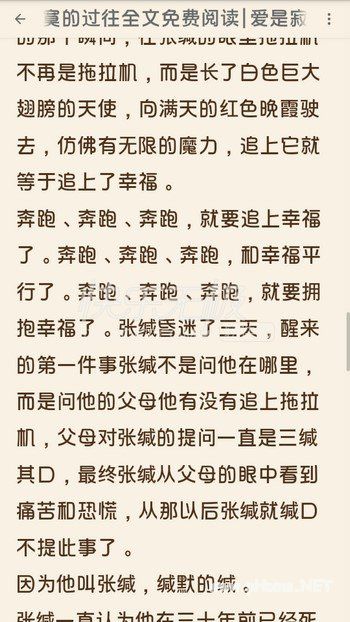 奔跑、奔跑、奔跑,就要追上幸福了。奔跑、奔跑、奔跑,和幸福平行了。奔跑、奔跑、奔跑,就要拥抱幸福了。张缄昏迷了三天,醒来的第一件事张缄不是问他在哪里,而是问他的父母他有没有追上拖拉机,父母对张缄的提问一直是三缄其口,最终张缄从父母的眼中看到痛苦和恐慌,从那以后张缄就缄口不提此事了。