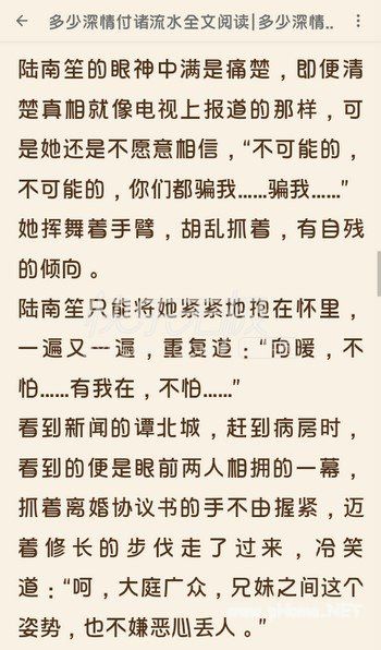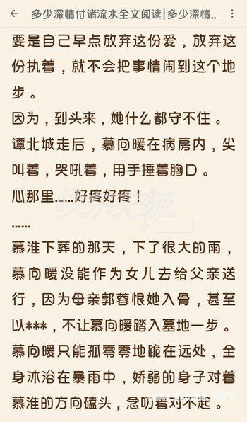 有一种想见不敢见得伤痛,有一种爱还埋藏在我心中,为告别过往而写的小说《多少深情付诸流水》。要是自己早点放弃这份爱,放弃这份执着,就不会把事情闹到这个地步。因为,到头来,她什么都守不住。谭北城走后,慕向暖在病房内,尖叫着,哭吼着,用手捶着胸口。心那里……好疼好疼!欢迎大家来本站下载《多少深情付诸流水》全文。
