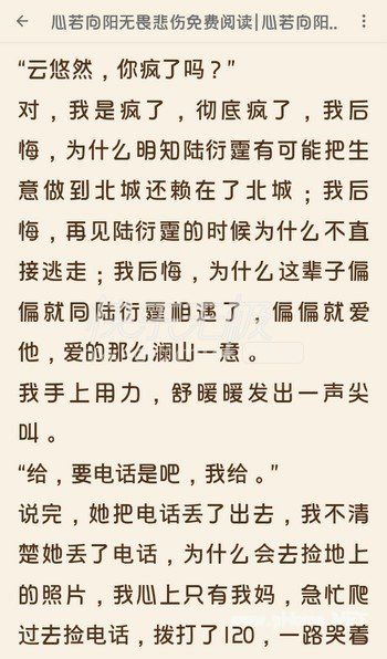 某天,你无端想起一个人,她曾让你对明天有所期许,但她却消失在了《心若向阳无畏悲伤》的故事里,完全没有出现在你的明天。对,我是疯了,彻底疯了,我后悔,为什么明知陆衍霆有可能把生意做到北城还赖在了北城;我后悔,再见陆衍霆的时候为什么不直接逃走;我后悔,为什么这辈子偏偏就同陆衍霆相遇了,偏偏就爱他,爱的那么澜山一意。在APP内搜索《心若向阳无畏悲伤》即可免费阅读,更多精彩内容尽在小编提供的APP。